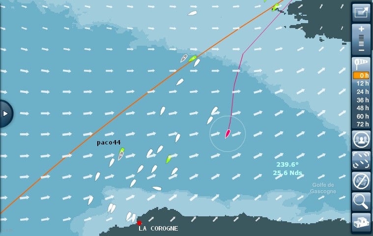 Mais je commence à redresser doucement, la vitesse diminue mais ce revirement ET le changement de vent de 20h devrait pouvoir me faire longer les côtes ibériques sans trop perdre de temps.